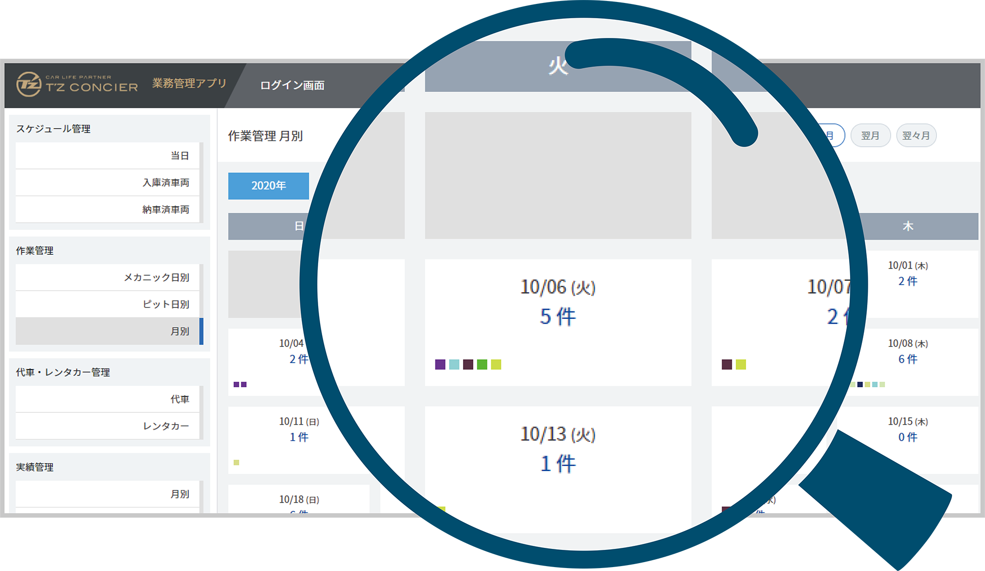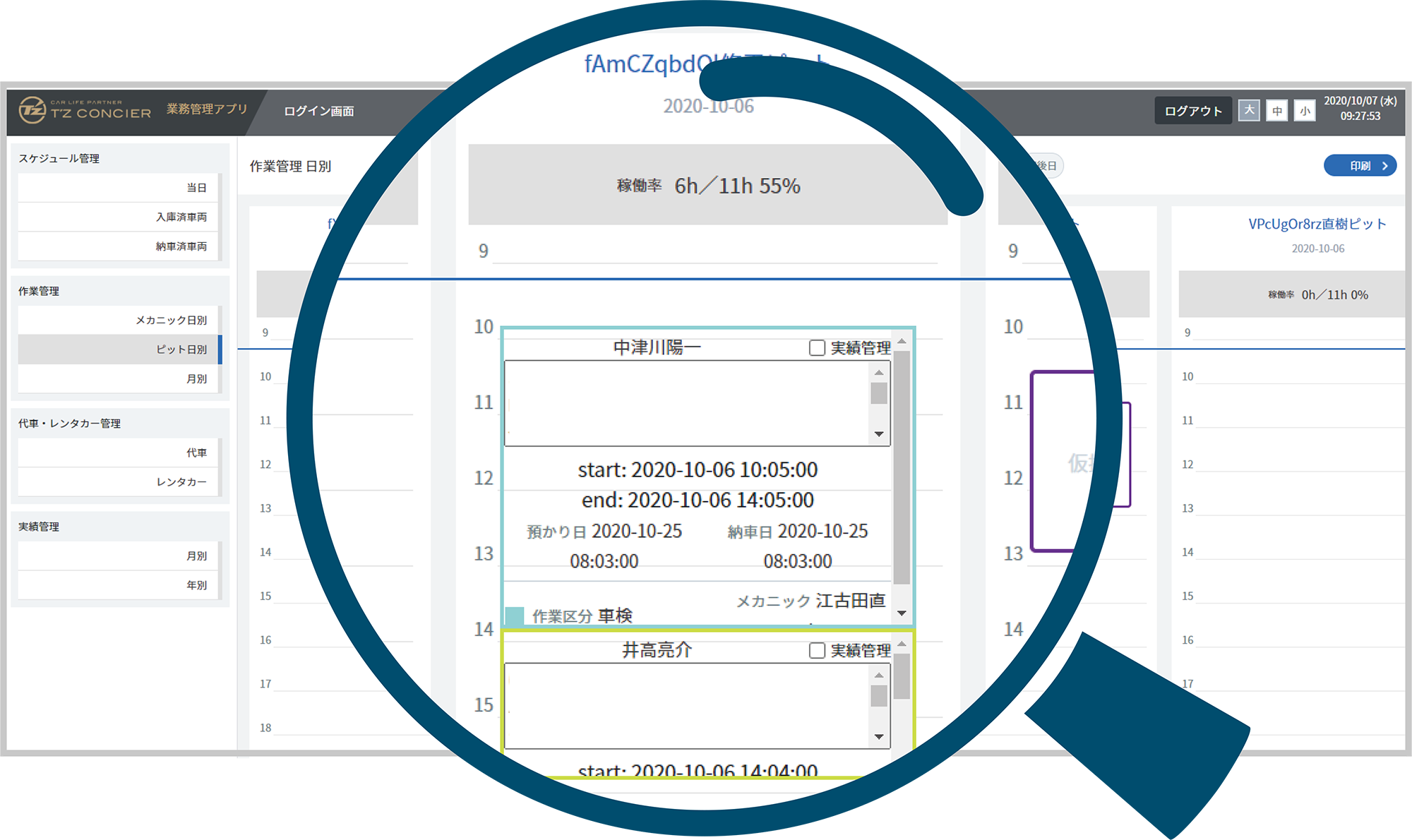 自動車整備工場や板金工場など自動車関連工場の社内資源(お客様、メカニック要員、施工設備など)を管理し、実績管理グラフと数値として可視化されます。これによって、日々の受注状況の進捗管理が容易に行えるため売上向上に必要な合理的な判断の助けとなります。